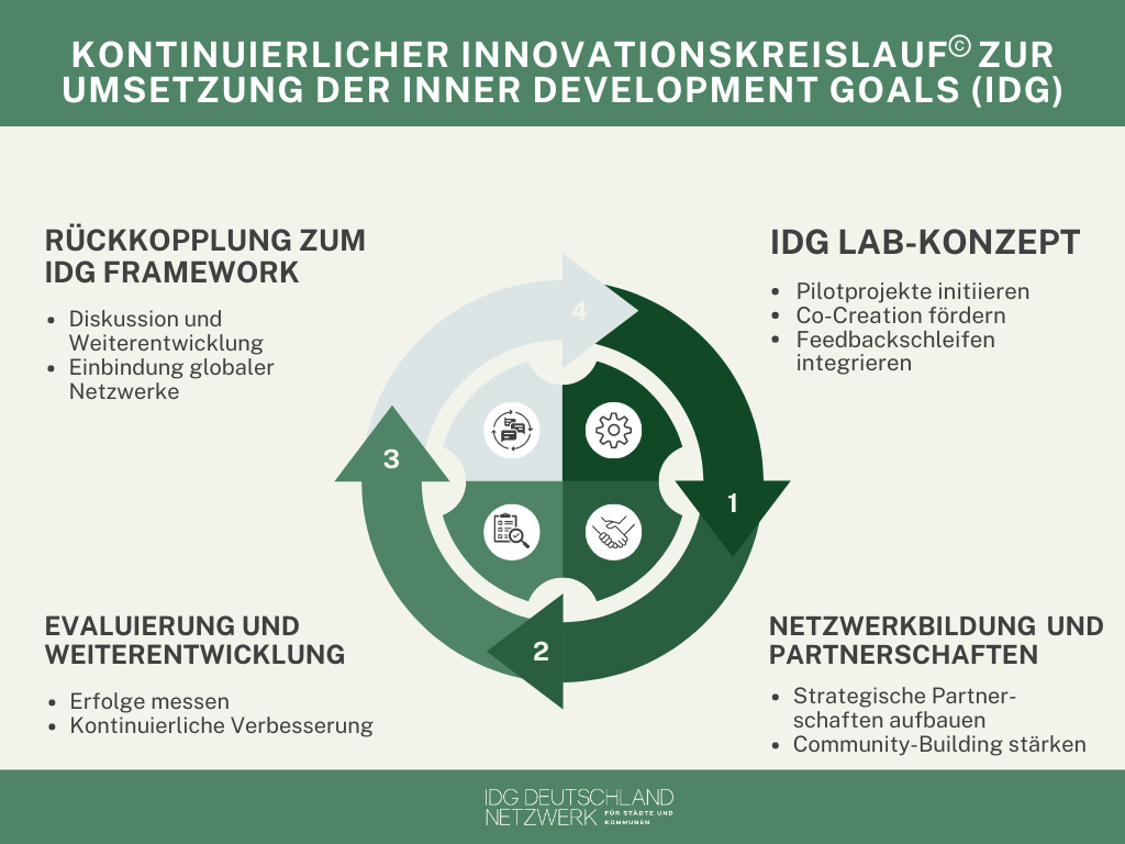Das Vorgehen des open-Source IDG Netzwerks basiert auf einem dynamischen Kreislaufprozess, bei dem Evaluierung und Feedback eine zentrale Rolle spielen. Dieser Kreislauf ermöglicht es, innovative Methoden zur Umsetzung der IDGs kontinuierlich zu testen, zu bewerten und weiterzuentwickeln. Durch gezielte Pilotprojekte, strategische Partnerschaften und fortlaufende Rückkopplung wird sichergestellt, dass die Ansätze stets aktuell und wirkungsvoll bleiben.